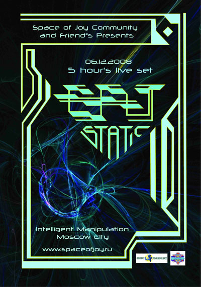 Intelligent Manipulation EAT STATIC 5 hour's live set (no laptop!) 6. 12. 2008 ![]() LINE UP: 21.00 - 22.30 - SWA (Татьяна Калмыкова, Петербург) 22.30 - 00.00 - Gavrila (Chill out Planet/Toksovo Family, Россия) 00.00 - 04.30 - EAT STATIC (Mesmobeat/Solstice/Tipworld/Interchill, United Kingdom) 04.30 - 06.00 - Deejayridoo (Psyberpunk, Germany) 06.00 - 07.30 - Tony Lizard (Glookaround, Крым) 07.30 - 09.00 - Ugaryan (HippieKillerProductions, Москва) 09.00 - 10.30 - Yeti (ZodiacTripAgency, Москва) Chill Out: на входе - 900 руб Яндекс.Деньги Счет №4100140652952 (отправьте номер